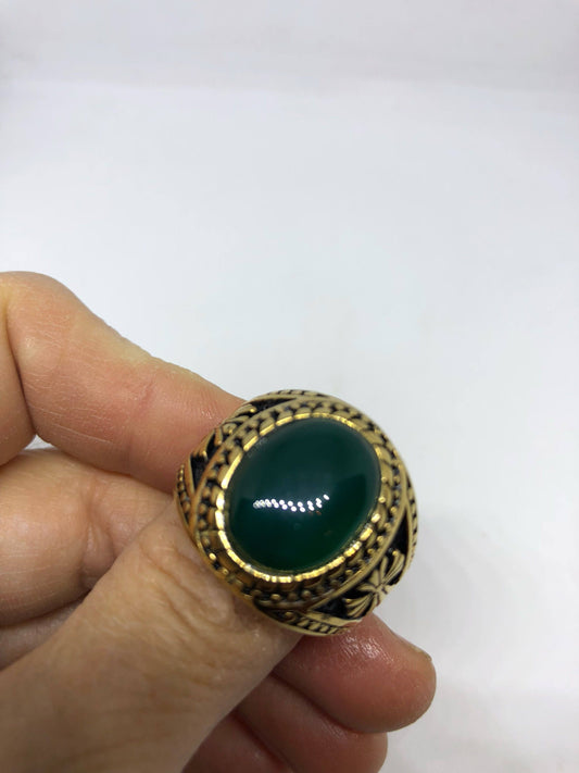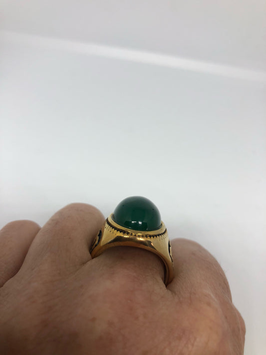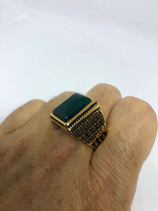 Vintage Gothic Gold Finished Genuine Green Chrysopraise Mens Ring