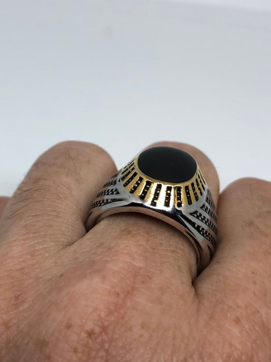 Vintage Black Onyx Southwestern Mens Eagle Golden Stainless Steel Ring