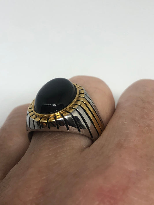 Vintage Gothic Black Onyx Gold Accent Stainless Steel Mens Ring