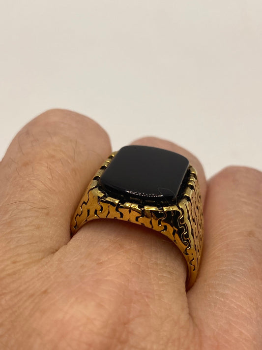 Vintage Gothic Black Onyx Golden Stainless Steel Mens Ring