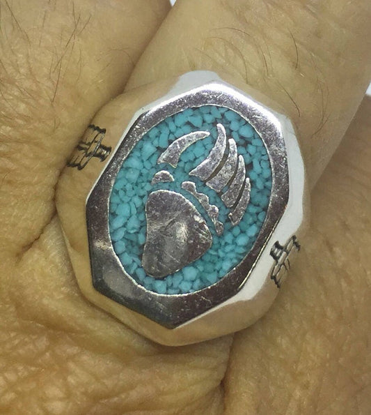 Vintage Native American Style Southwestern Turquoise Stone Inlay Mens Bear Paw Ring