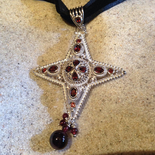 Vintage Bohemian Garnet Cross Choker 925 Sterling Silver Pendant Necklace