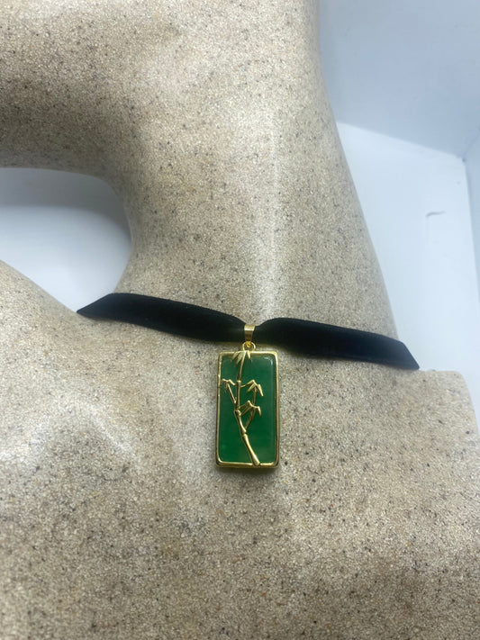 Vintage Green Jade Bamboo Choker Gold Finish Necklace Pendant