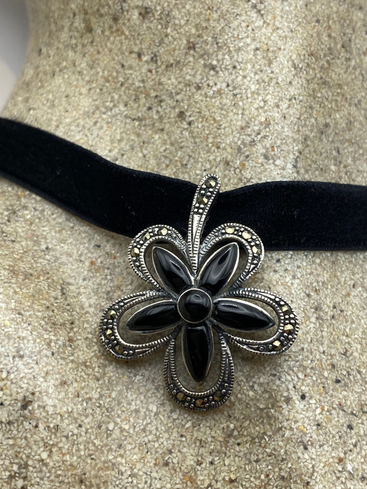 Vintage Marcasite Choker 925 Sterling Silver Black Onyx Pendant Necklace