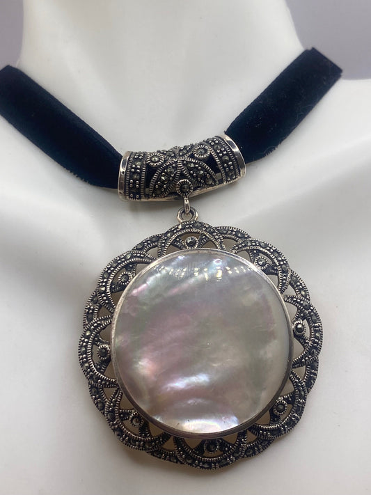 Vintage Deco Marcasite 925 Sterling Silver Mother of Pearl Deco Pendant Necklace