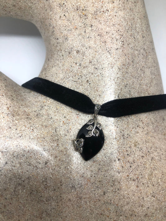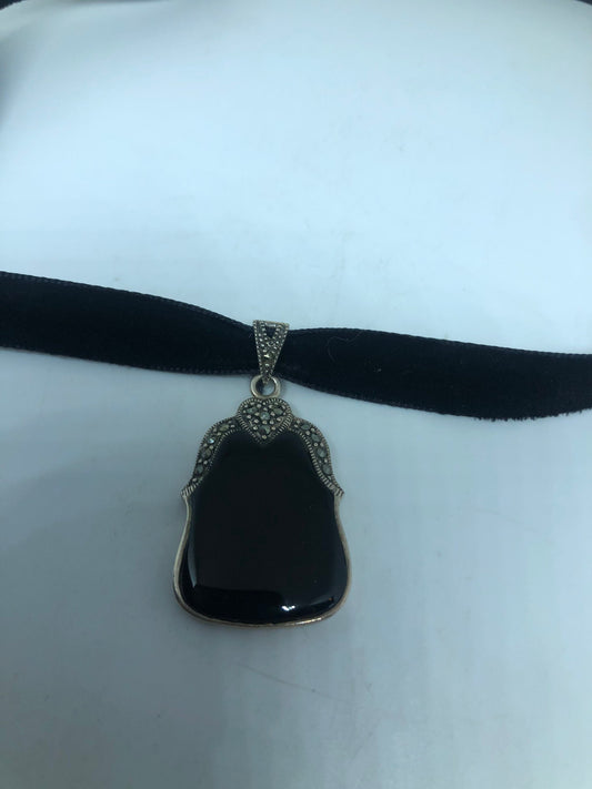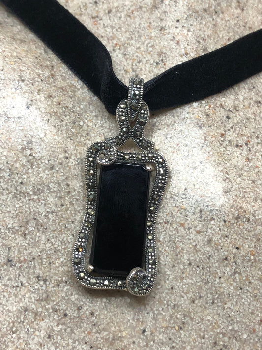 Vintage Black Onyx Marcasite Choker 925 Sterling Silver Deco Pendant Necklace