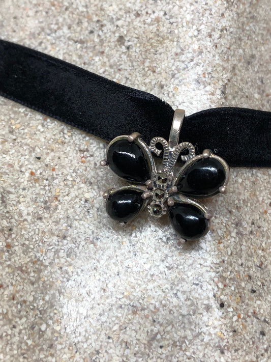 Vintage Black Onyx Marcasite Butterfly Choker 925 Sterling Silver Deco Pendant Necklace