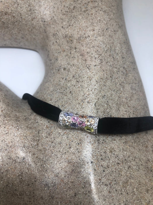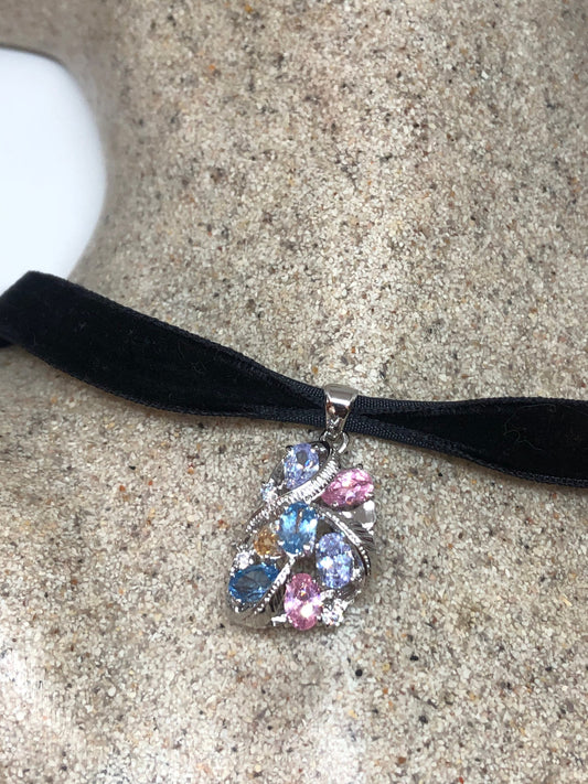 Vintage Pastel CZ Choker Sterling Silver Pendant Necklace