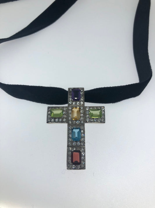Vintage Handmade 925 Sterling Silver Mixed Gemstone Cross Antique Pendant Necklace