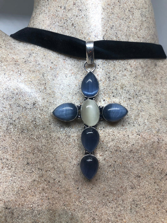 Vintage Moonstone and Blue Cats Eye cross Necklace Choker