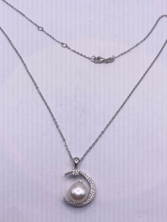 Vintage Crystal Crescent Moon Genuine White Pearl 925 Sterling Silver Choker Pendant Necklace