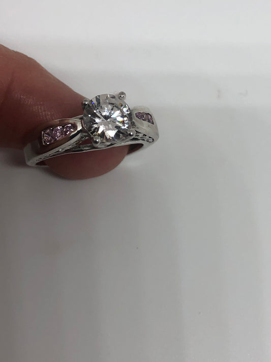 Vintage Clear and Pink CZ 925 Sterling Silver Cocktail Ring Size 8