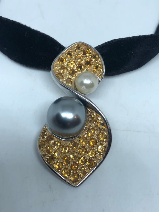 Vintage Citrine Pearl Choker 925 Sterling Silver Deco Pendant Necklace