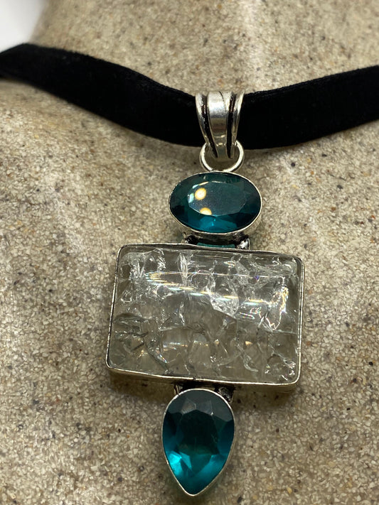 Vintage Clear Crackled Aqua Glass Antique Velvet Choker Necklace