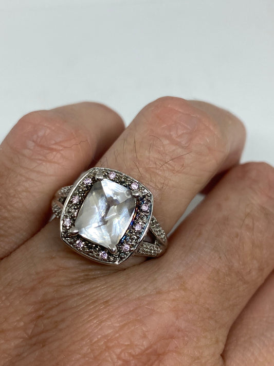 Vintage Clear Quartz Pink Sapphire 925 Sterling Silver Cocktail Ring Size 6.5