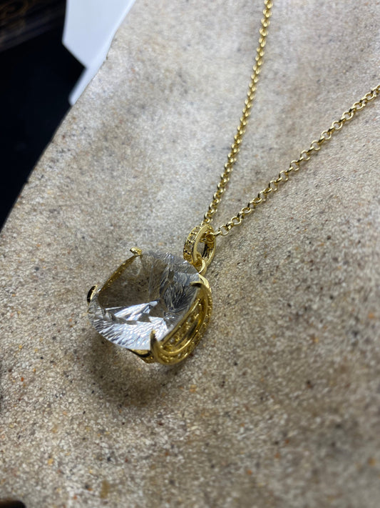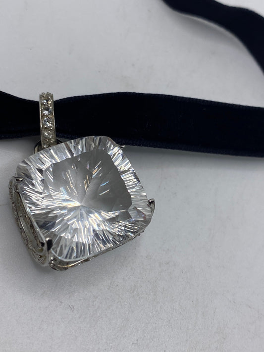 Vintage Clear Quartz Wiccan Moon 925 Sterling Silver White Sapphire Pendant Choker