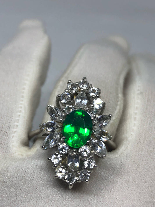 Vintage Handmade Genuine Green Flourite and White Sapphire 925 Sterling Silver Deco Ring