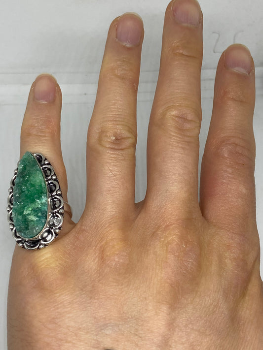 Vintage Handmade Genuine Green Mystic Chrome Diopside Druzy Filigree Setting Silver Ring