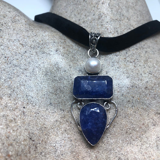 Vintage Raw Blue Sapphire and Pearl Choker Pendant