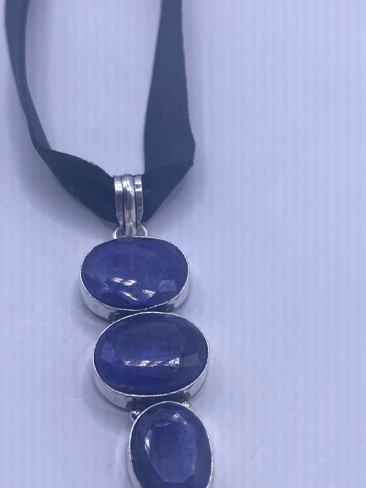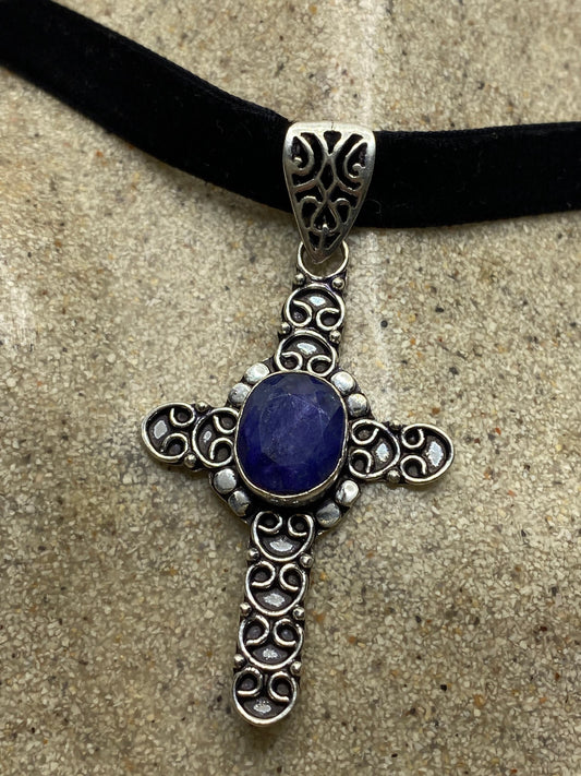 Vintage Raw Blue Sapphire Cross Choker Pendant