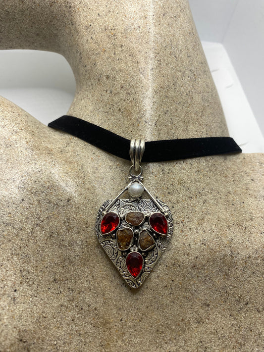 Vintage Raw Tourmaline Ruby Glass Black Velvet Choker Necklace