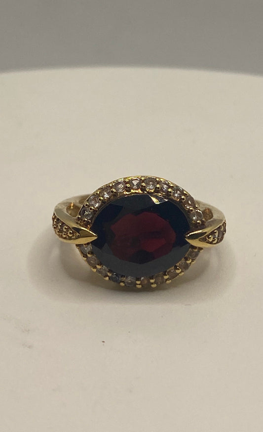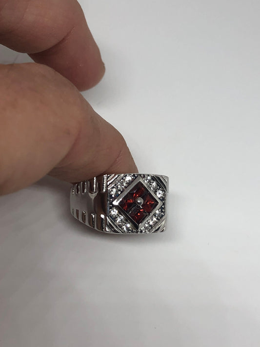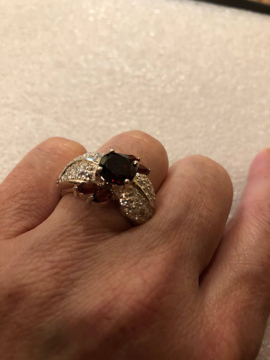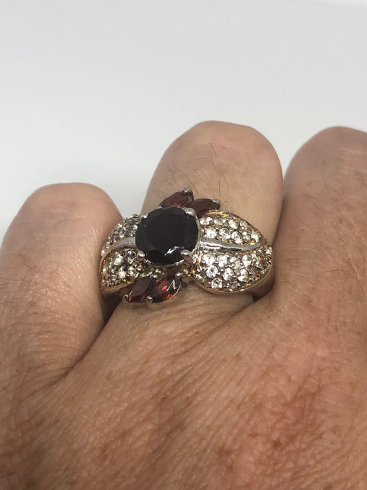 Vintage Red Bohemian Garnet Ring White Sapphire 925 Sterling Silver Cocktail Statement