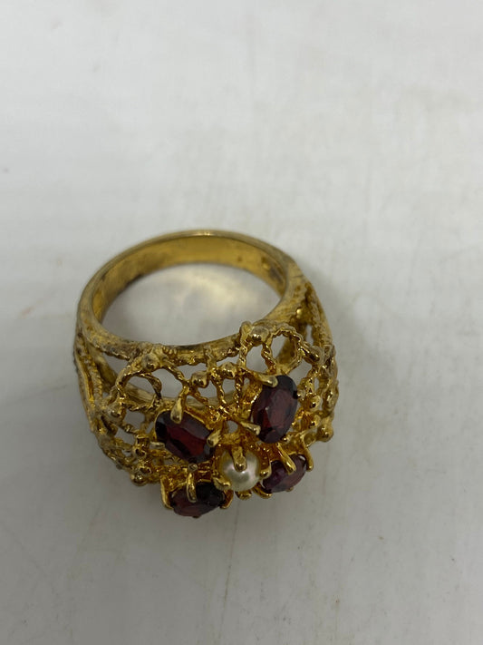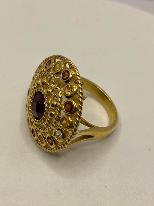 Vintage Red Bohemian Garnet Ring Golden 925 Sterling Silver Cocktail Statement