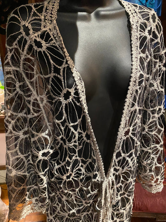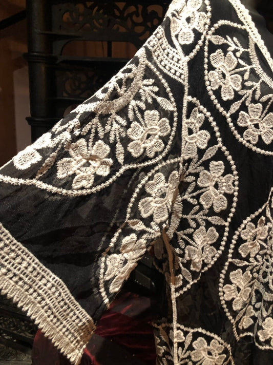 Vintage Style Black Lace Pink Embroidered Flower Kimono Robe