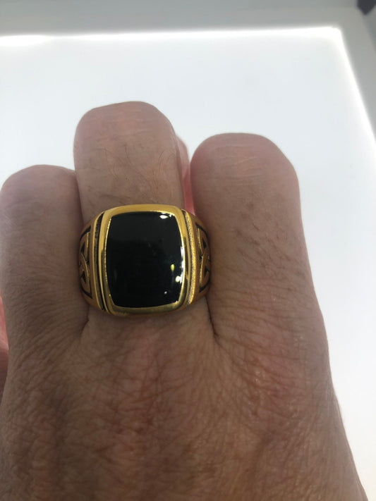 Vintage Celtic Black Onyx Golden Stainless Steel Mens Ring