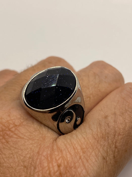 Vintage Yin Yang Black Goldstone Stainless Steel Mens Ring