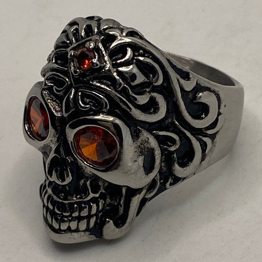 Vintage Gothic Silver Stainless Steel Skull Catacombs Red Crystal Mens Ring