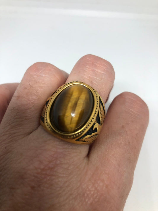 Vintage Gothic Gold Finished Stainless Steel Genuine Tigers Eye Dragon Mens Ring