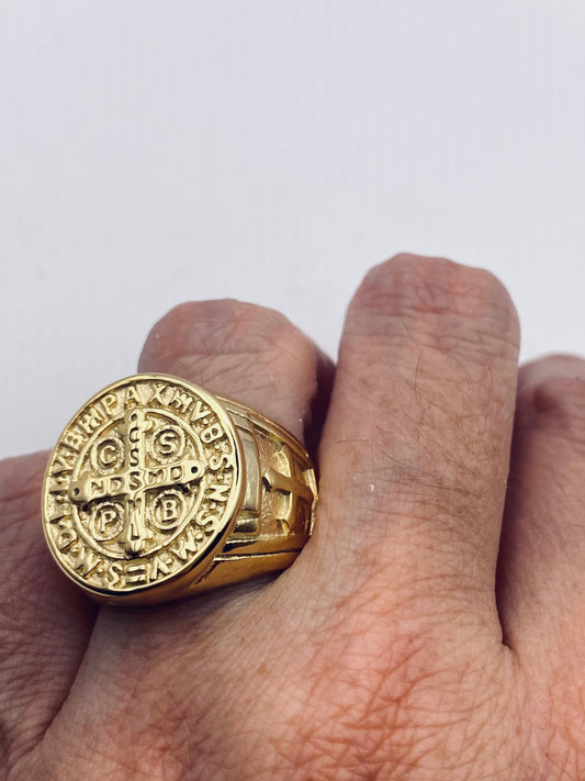 Vintage San Bernardino Golden Stainless Steel Cross Mens Ring Wax Seal