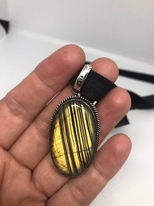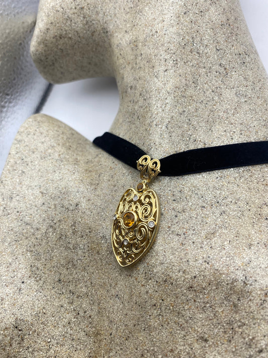 Vintage Gold Pendant | Hungarian Genuine Citrine Gemstone Pendant | Golden 925 Sterling Silver Ribbon Choker Necklace