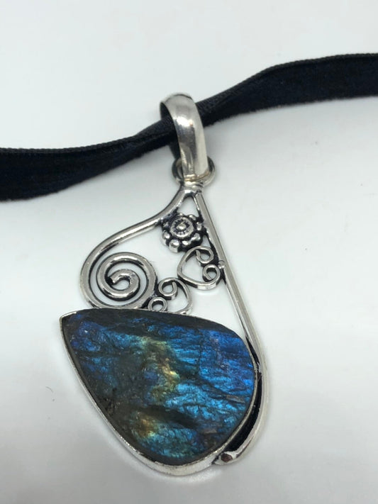 Vintage Silver Genuine Rainbow Labradorite Choker Black Velvet Necklace.