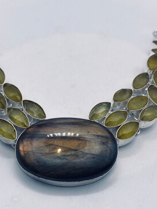 Vintage Rainbow Labradorite Amber Glass Choker Silver Collar Bib Necklace