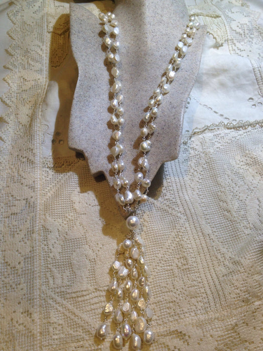 Vintage Hand Wrapped Genuine White Pearl tassel Necklace
