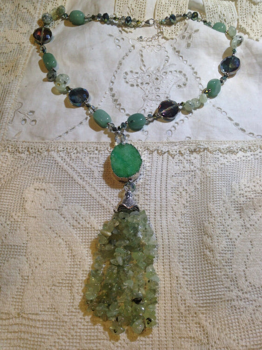 Handmade Green druze Quartz and Aventurine Crystal Necklace