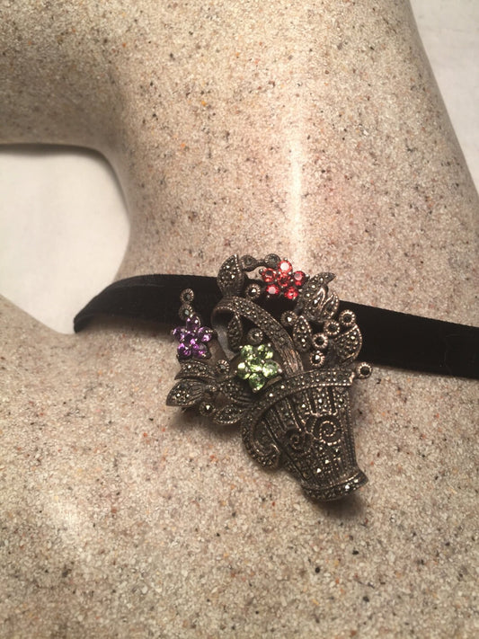 Vintage Marcasite 925 Sterling Silver Peridot Amethyst Garnet Basket Pendant Necklace
