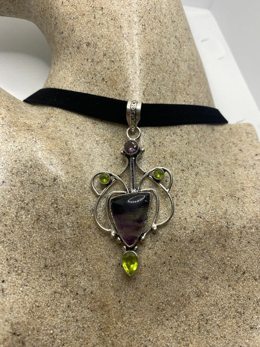 Vintage Cabochon Cut Droplet Deep Purple Genuine Fluorite Peridot Choker Necklace