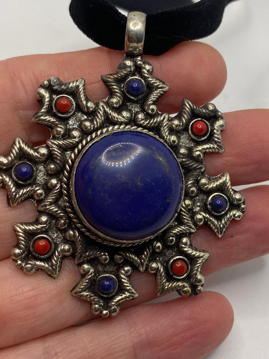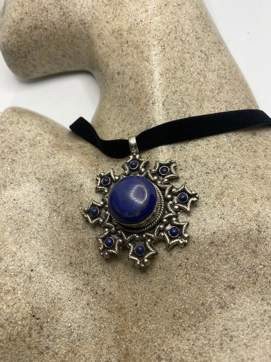 Vintage Tibetan Lapis Star Black Velvet Choker Necklace.