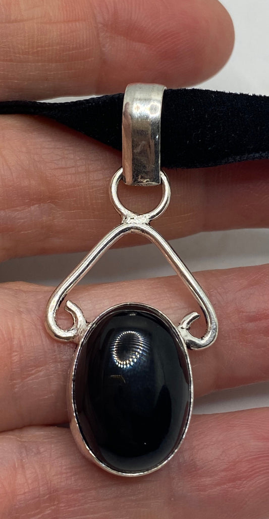 Vintage Silver Genuine Black Onyx Dangle Pendant Necklace
