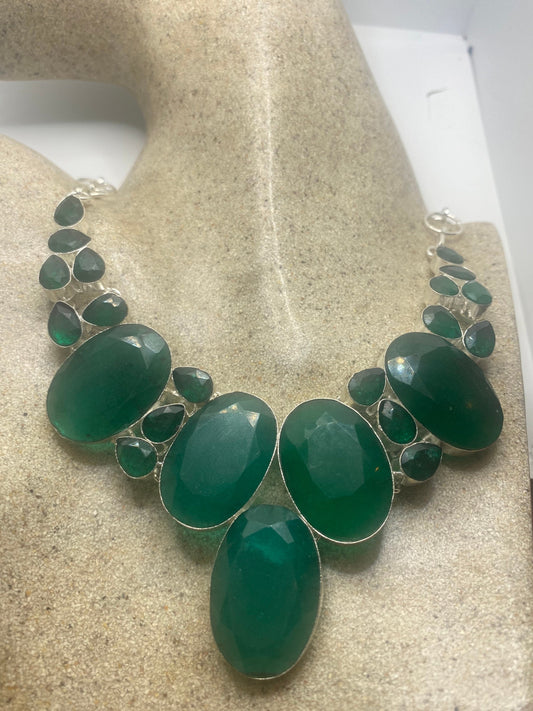 Vintage Silver Genuine Green Quartz Gemstone Statement Bib Necklace.