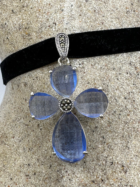 Vintage Marcasite Choker 925 Sterling Silver Deco Blue Crystal Cross Pendant Necklace