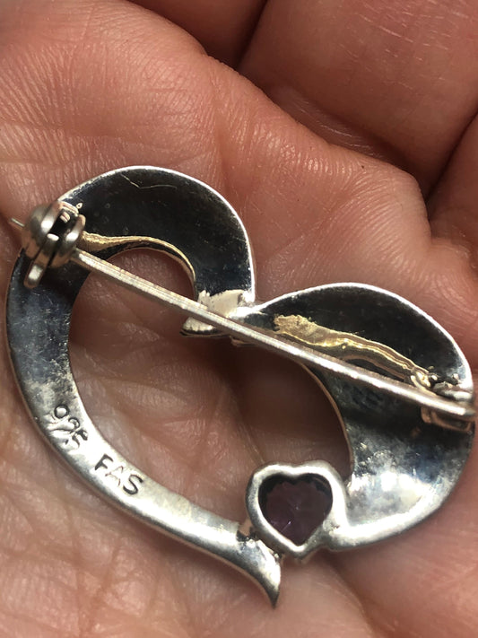 Vintage Heart Pin Marcasite 925 Sterling Silver Amethyst Valentine Brooch