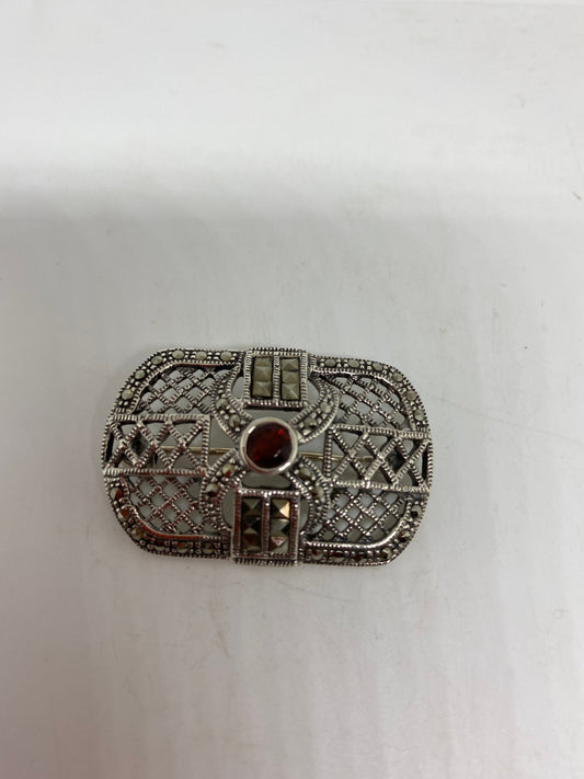 Vintage Red Garnet Pin Marcasite 925 Sterling Silver Brooch
