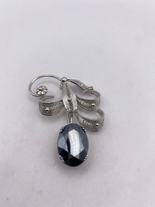 Vintage Hematite Deco Flower 925 Sterling Silver Filigree Brooch Pin