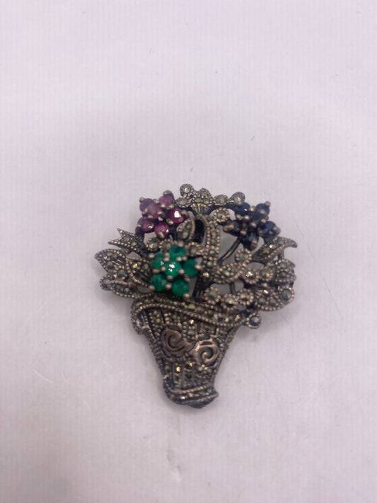Vintage Flower Basket Pin Marcasite 925 Sterling Silver Brooch Choker