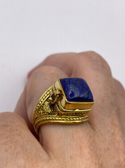 Vintage Blue Lapis Brass Poison Pillbox Ring