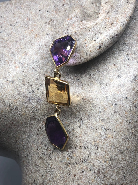 Vintage Handmade Golden 925 Sterling Silver Amethyst Citrine Earrings
